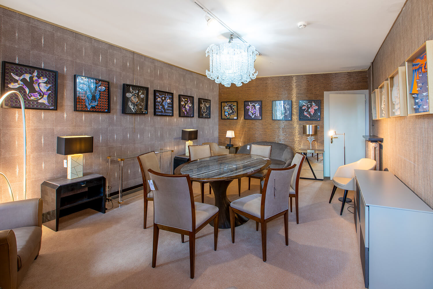 Für die Dekoration des Ausstellungsraums in der Grand-Rue 94 in Rolle überließ Moinat.com Frau Diebold die freie Hand, die dem Raum Leben und Farbe verlieh.