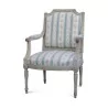 Salon Louis XVI en hêtre, Paris, comprenant un canapé et deux fauteuils. Hauteur assise canapé : 54 cm. Hauteur assise fauteuil : 54 cm Dimensions fauteuil : L64 x H96 x P65 cm Dimensions canapé : L110 x H104 x P70 cm.