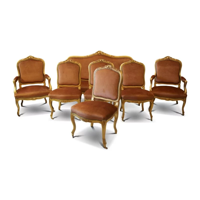 Гостиная в стиле Людовика XV и Наполеона III из богато украшенного резьбой орехового дерева с позолотой, включает диван, два кресла и четыре стула, обитые коричневым искусственным бархатом. Можно стирать. Высота сиденья дивана: 40 см. Высота сиденья кресла: 45 см. Высота сиденья стула: 45 см. Размеры дивана: Ш 163 x В 105 x Г 67 см Размеры кресла: Ш 62 x В 99 x Г 59 см Размеры стула: Ш 50 x В 107 x Г 57 см.